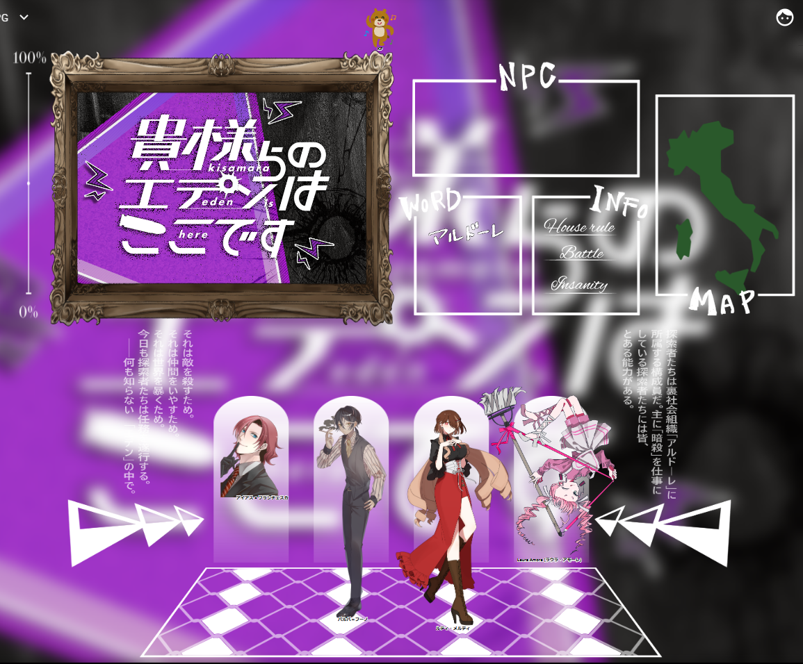 ブログ移行しました! 2023-04-18 ※移行できたとは言ってない※ ここ数年、一次創作に増して、TRPGとの出会いによりオンラインで様々交流したり、立ち絵を描いたりという機会に恵まれるようになりました。 昨今のSNS戦国乱世の世情もあり、この度、ブログを新設することにしました。 相変わらずの亀更新、雑更新になるかとはありますが、広大なインターネッツにおける終の棲家として大事にしていきたいと思っています。 よろしくお願いします。